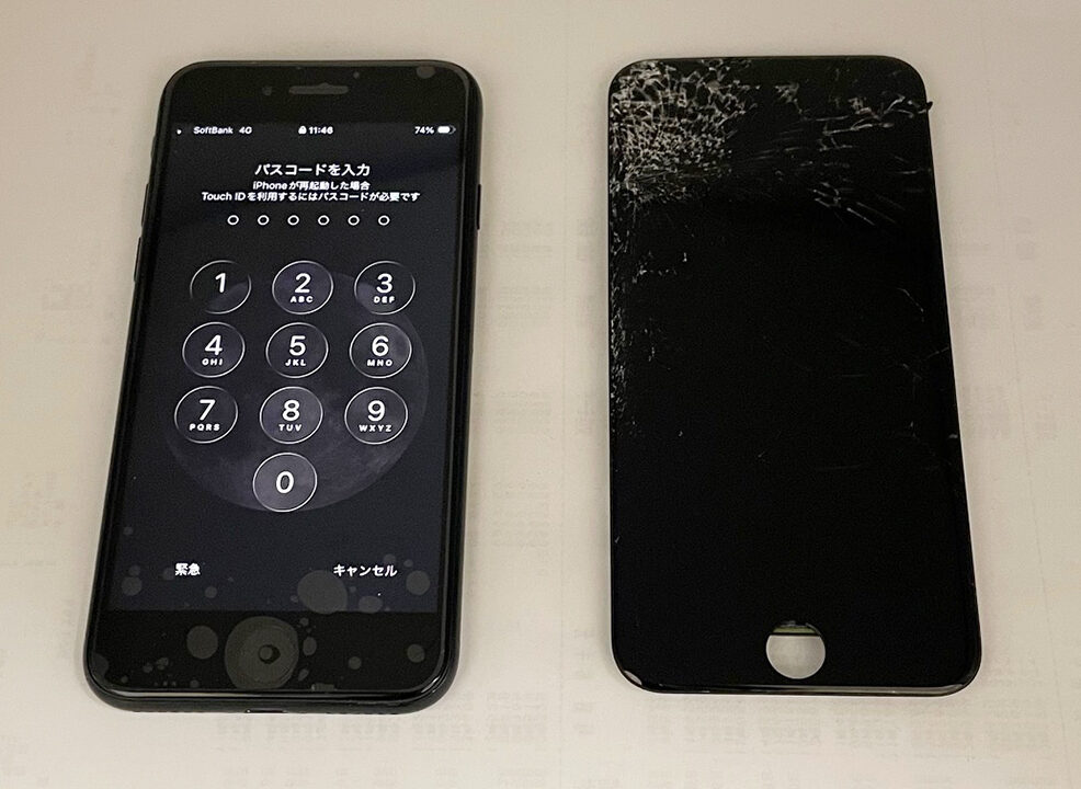 iphoneSE3の画面交換をさせて頂きました。ガラス(デジタイザー)割れと液晶不良で一部タッチが出来ない状態でした。画面上部の衝撃は結構激しかったので周辺部品も大丈夫かっと?心配開いていましたが、幸い裏面のガラスは割れていなく、フロントカメラ周りの機器も大丈夫でした。
